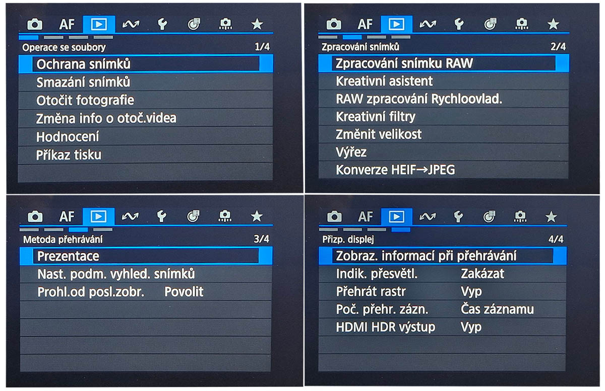 BOMBASTICKÉ MENU co do rozsáhlosti nabízených funkcí...! Optikou „Poučeného Canon PowerShot V1 s nasazenou kožešinkou proti větruModrá ČTVEŘICE podnabídek z ze skupiny přehrávání...laika“ chci vypíchnout Fičury, nevídané v amatérských mašinkách. I když jsem se snažil o „leporela“ čili sestavy VĚTŠINY nabídek STROJE naší Fotodokumentací, zmíním pár extras. V ČERVENÉ SKUPINĚ a tam v první podnabídce je odrážka Dual Pixel RAW, ve druhé pak co pátý řádek ND filtr (Vyp/Zap), což u foťáků také není běžnou funkcí (ano, zrovna kolega Canon PS-G7X MIII ji má). Třetí podnabídka obsahuje mj. položku Barev. prostor (možnosti sRGB nebo Adobe RGB) a níže je pak Snímání v HDR (PQ) a Režim HDR…