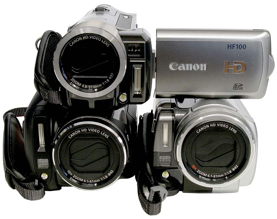Trojice ze současných formátů Canon (Klikni pro zvětšení)Hodnocení a závěr. Myslím, že poměr velikostí mašinek a množství textu už naplnil přemíru všehomíry a že bych toho mohl nechat. Za obchodníky tipuji, že kartovky mají velmi světlou budoucnost, protože právě ABSENCE čehokoli rotačního budí (zejména u mladších generací a počítači aspoň trošku tknutých) VELKOU DůVěRU. Navzdory vyjmenovaným neduhům, navzdory nepatřičnostem ve výbavě a navzdory pořizovacím cenám mají pravděpodobně ony kartové videokamery - jakkoli je tento výraz pro popisované téměř expresivním - perspektivu jako hrom. Abych nezapomněl vyznačit jediný rozdíl mezi Stovkou a Desítkou: Ve zmíněné logice značení vyšším-nižším číslem výrobce je dražší HF10ka vybavena vestavěnou "duální flash-pamětí" (jak píše český Canon) 16GB, což umožňuje i bez zasunuté SD-karty nahrávku až 6h 5min v režimu LP - z mého textu lze odvodit asi 2 hodiny v nejvyšší kvalitě FXP. Nižší z modelů HF100, jenž byl v předprodejním vzorku předlohou k recenzi, žádnou interní pamě neobsahuje. Novinky jsou tedy výborně vybavenými prcky k NEJamatérštější kameramanské práci. Živnostníci a vyznavači staré-dobré pásky s HDV-rozlišením mohou mít ale problémy s krční páteří, jak budou kroutit hlavou... Už pochopil čtenář název dnešní recenze?